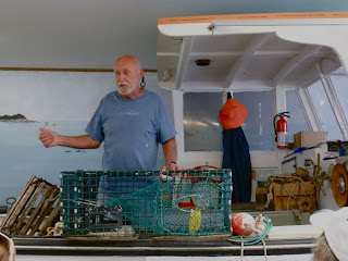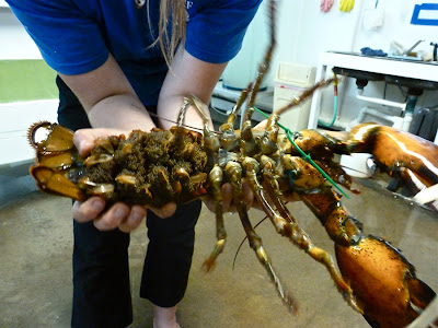 Then we listened to a young woman talk about the lobster hatchery. It is a small operation, but very successful in raising lobsters to a young stage to be released into the ocean. She showed us a pregnant lobster with THOUSANDS of eggs attached to her body waiting for the right time to release--when the eyes on the little bitty eggs are bluish. That brownish mass? It's thousands and THOUSANDS of eggs!