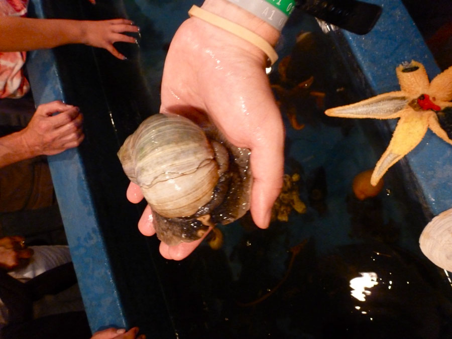 Sparky loved the Discovery Pool Touch Tank...One of the young guys, we think he was a college student working there for the summer, gave a half hour talk about the different animals found in the ocean in the area. He takes each creature out one by one, you dip your hands into salt water so you can handle them. He passes sea stars around, a scallop, a sea cucumber, and several more species and you get to know them up close and personal by hearing lots of facts about each one. We learned some great stuff today...the most interesting creature was the sea cucumber..It was slimy and felt like a miniature jello football. The sea cucumber ejects its intestines and stomach contents when threatened by a predator, hoping that the predator will eat that stuff and not the sea cucumber! He then grows a new intestine in a short period of time. UGH! But interesting! While he was holding the sea cucumber, it squirted something out one end. Sparky asked if it was peeing, but no, it was just ejecting water that passes through its body. (Can't take that woman anywhere without her asking embarrassing questions! mutters E.) This creature (mollusk?) can take his "foot" and curl it all around inside his shell and "shut" the "door" so a predator can't eat him!