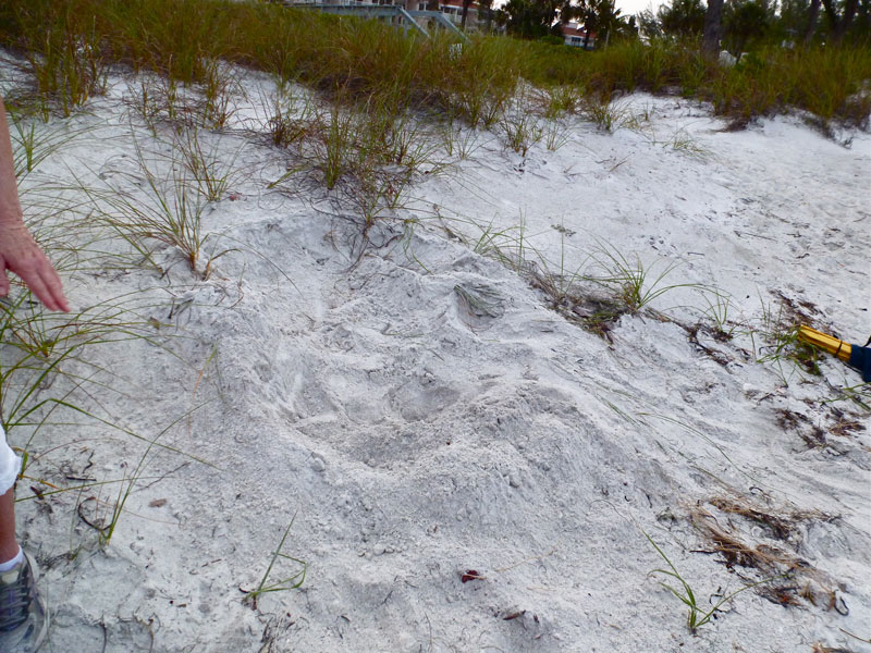 A Mote worker spoke to a small group of us first, giving us some general information about loggerheads, and had some exciting news! She got to see one come out of the water to lay its eggs about 45 minutes earlier! The turtle had come and gone, but she had more to show us. C'mon! Sparky is ready to go! We walked the beach for about fifteen minutes until we came upon this....